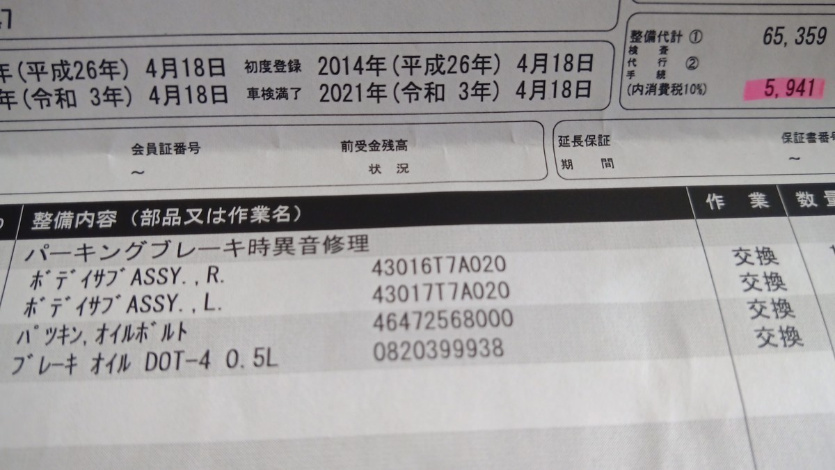 2020-12-13 異音再発⇒放置 愛車(VEZEL) VEZEL HX パーキングブレーキ作動時の異音 dmx96284.hatenadiary.jp 初回車検時に無料改修していました。 dmx96284.hatenadiary.jp 6年目、再発しました、ブレーキをかけたり、解除するとキュイーンと唸ります。 ディーラーに確認したところ、2回目以降は有料になるとのことでした。 パーキングブレーキ性能は正常でしたので、修理は見送ることしました。