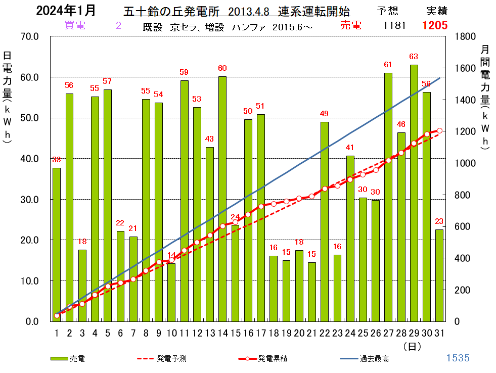 既設分も含めてパワコンから直接得た数値ではなくスマートメータによる総売電データとなるため、既設・増設の比較ができない。また、実発電量より僅かに低く、とくに夏場は換気空調による自家消費分がさらに差し引かれ少なくなる。