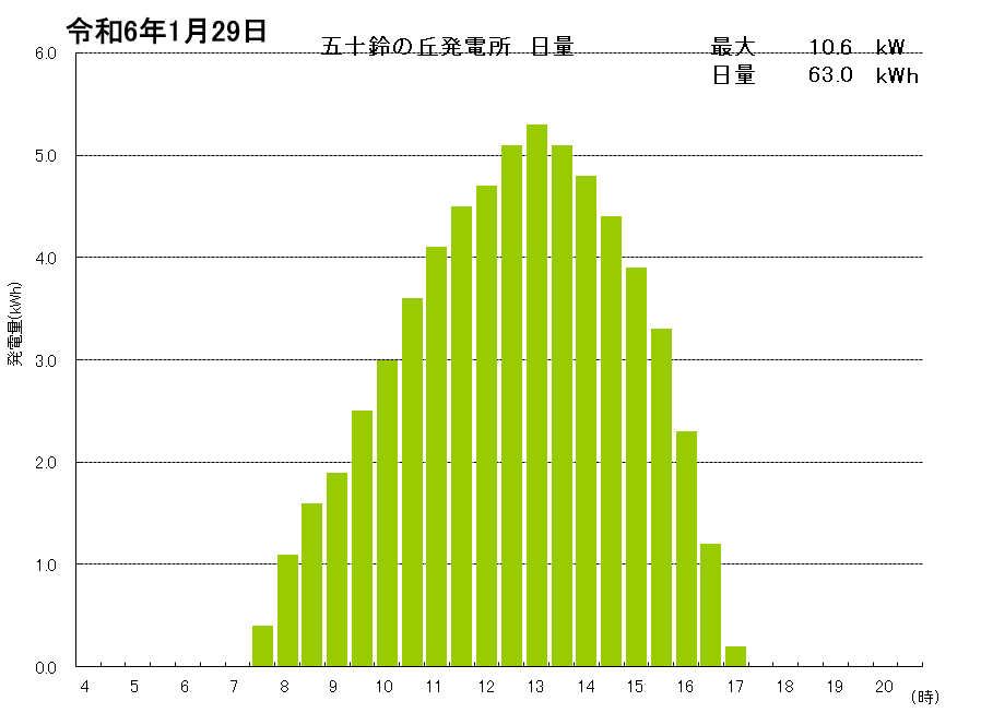 五十鈴の丘発電所も余剰配線方式ですが、現在のところ、接続している負荷が非常に少ないため、消費量がわずかであるので、消費量、発電量、自家消費、買電量はグラフ化していません。