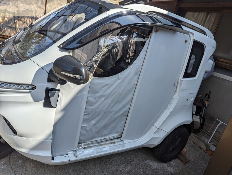 2024-02-24 冬仕様 愛車(トライク) URBAN TRIKER エアコン装備の無いトライク 冬走行仕様 まず、バックドア閉止 そして、ルーフ閉止 もちろん、サイドレインガードと防寒レッグカバー装着 さらに、電熱グッズを併用 これらによりバイクよりは防寒能力も高い、 でも、横風に弱く、ハンドルを取られやすいので十分注意が必要、出かけるときに強風注意報発令時は、運転することを避けて、奥のNBOX拝借
