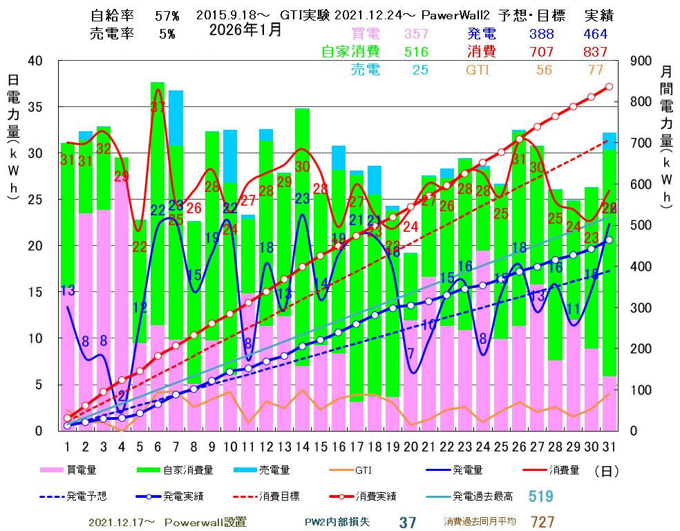 - 消費量 837kWh(GTIソーラー実験による+77、蓄電池による充放電ロス-37補正)